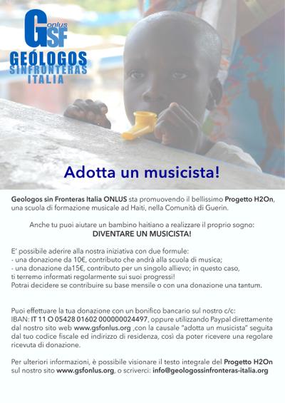 Per sostenere il Progetto H2On, Geologos sin Fronteras-Italia-ONLUS lancia la campagna "adotta un musicista", per dare la possibilità a chiunque lo desiderasse, di sostenere la scuola o i futuri musicisti. E’ possibile aderire alla campagna o con una donazione di 10€ (contributo per la scuola) o 15€ (contributo per un singolo allievo del quale si riceveranno notizie) mensili o una tantum. E' possibile effettuare la donazione o attraverso il nostro c/c (IBAN: IT11 O054 2801 6020 0000 0024 497), o con il metodo Paypal direttamente dal sito,con la causale “adotta un musicista” seguita dal proprio codice fiscale ed indirizzo di residenza, così da poter ricevere regolare ricevuta di donazione o anche attraverso i seguenti siti: http://www.buonacausa.org/cause/adotta-un-musicista http://www.retedeldono.it/progetti/geologos-sin-fronteras-italia-onlus/adotta-un-musicista http://www.iodono.com/geologossinfronteras-italia
