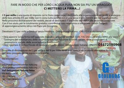 Il 5 per mille è una quota di imposte cui lo Stato rinuncia per destinarla alle organizzazioni non-profit a sostegno delle loro attività; il 5 per mille non ti costa nulla perchè non è una tassa in più, mentre per noi significa molto. Nella prossima dichiarazione dei redditi decidi di destinare il 5 per mille dell'IRPEF alla nostra Associazione. Con il tuo aiuto, per te totalmente gratuito, contribuirai concretamente a sviluppare i nostri Progetti di approvvigionamento idrico nei paesi più bisognosi. Devolvere il 5 per mille a Geologos sin Fronteras-Italia-ONLUS è molto semplice: .Devi apporre la tua firma nell'apposito riquadro (presente sui Mod. CUD, 730, Unico e Unico MINI) alla voce "Sostegno del volontariato, delle organizzazioni non lucrative di utilità sociale, delle associazioni di promozione sociale, delle associazioni e fondazioni" .Devi riportare il codice fiscale di Geologos sin Fronteras-Italia-ONLUS: 05372580968 Le scelte di destinazione del 5 per mille e dell'8 per mille IRPEF NON sono in ALCUN MODO alternative tra loro, pertanto possono essere espresse entrambe.